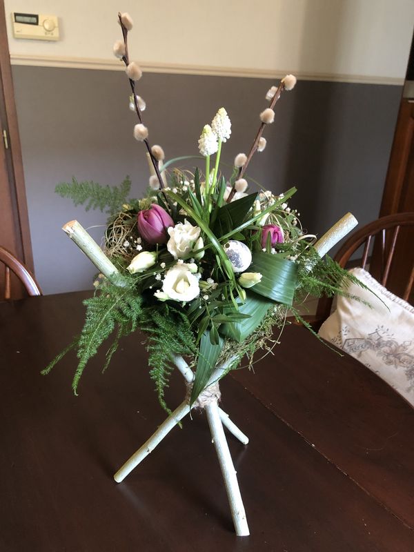 De laatste jaren is speciaal paasbloemwerk steeds meer in opkomst. Wat ooit heel eenvoudig begon met een paar eitjes en wat kuikentjes groeide in de loop der tijd uit tot een echte schikperiode. Steeds meer mensen ontdekten dat je ook met paasschikken volop je creativiteit kwijt kunt en dat er veel ruimte is voor nieuwe ideeën. Daarom leek het ons leuk om te experimenteren met andere materialen en kleuren en te ontdekken dat een beetje durf binnen het bloem schikken kan leiden tot verrassend mooie resultaten. “Nieuwsgierig? Dat mag! Wat we gaan maken houden we nog héél even geheim… maar medio maart schittert het bloemstuk op onze website.