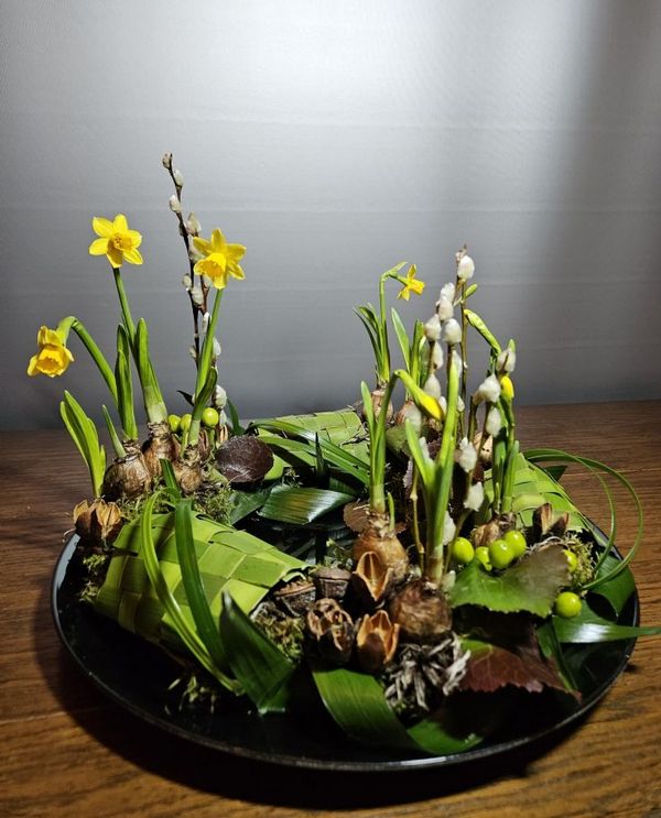 Tijdens deze workshop ontdek je hoe weven met natuurlijke materialen een bloemstuk naar een hoger niveau tilt. We werken met lange bladeren en maken drie gesloten weefsel met een rustige, nette uitstraling, waarin vervolgens prachtige voorjaars bloemen worden verwerkt. Het resultaat is een harmonieuze combinatie van structuur en frisheid, waarin techniek en creativiteit samenkomen.